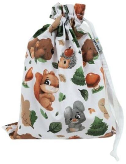 Állatos tornazsák (erdei)Erdei állat mintás pamut tornazsák Kiváló minőségű, 100% pamutból készült tornazsák. Óvodába és iskolába is egyaránt ideális választás, melybe a gyermek könnyedén tárolhatkja tornafelszerelését. A tornazsák a tetejébe varrt zsinorral záródik. Méretei: 28x38 cm.