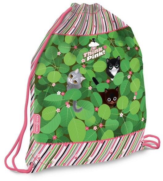 A Think Pink tornazsákon cicák játszanak zöld növények alatt.   Cicás mintája és színei miatt kisiskolás kislányoknak ajánlott.