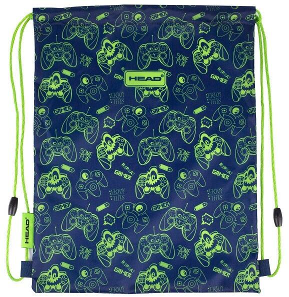 A kék tornazsákon neon zöld színű játék konzolok szerepelnek.