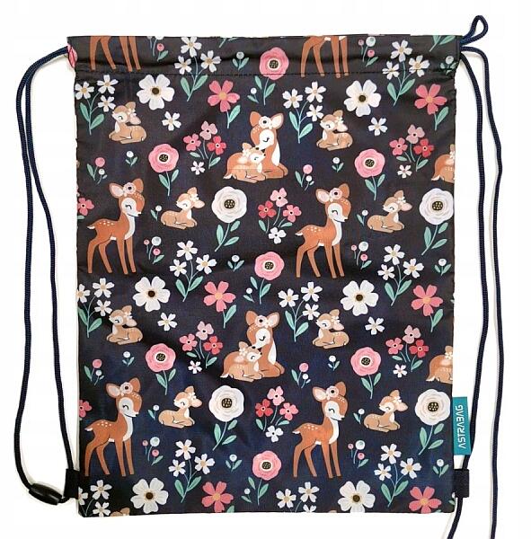 Divatos, minőségi tornazsák virágokkal és szundikáló őzikékkel mintázva.
