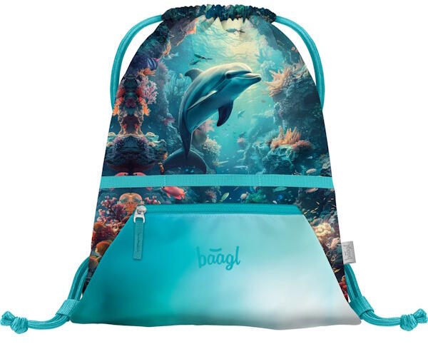A világoskék tornazsákon delfin tűnik fel, akár egy varázslatos fotó az óceán mélyéről.