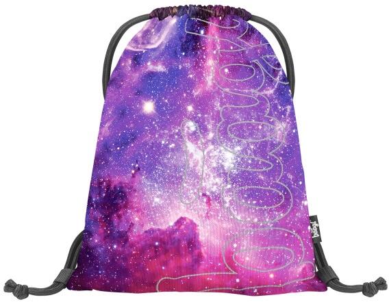 A minőségi Baagl tornazsák anyaga lilás árnyalatú, távoli galaxysokra emlékeztető mintát kapott, fényvisszaverő elemek gondoskodnak a biztonságról. Hátoldala egyszínű.