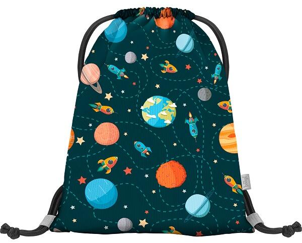 A minőségi Baagl tornazsák türkizkék anyagán a világűr látható élénk színű bolygókkal és rakétákkal.