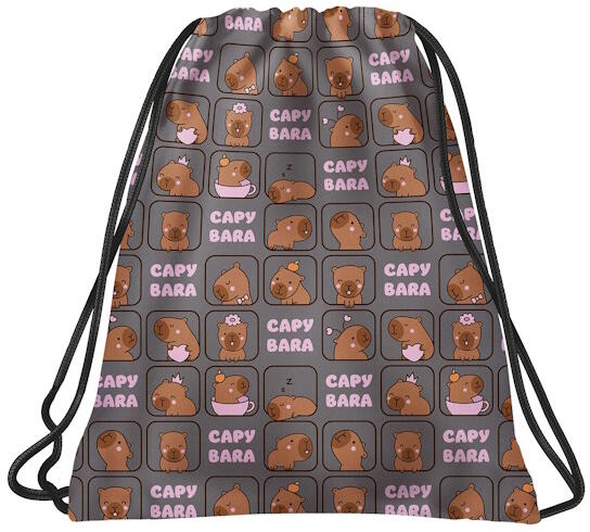 Vidámságot hoz a suliba a cuki capybara minta. A szürke tornazsák megmutatja neked egy kis capybara napi időtöltését. Az igazán egyedi rajzolt minta és  színkombináció, minden cukiságot kedvelő lánynak elnyeri tetszését. Kiváló kiegészítője lesz a kislányok iskolatáska szettjének.
