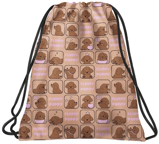 A barna színárnyalatú tornazsák megmutatja neked egy bolyhos kutyus napi rutinját. Az igazán egyedi rajzolt minta és  színkombináció, minden cukiságot kedvelő lánynak elnyeri tetszését. A lányos tornazsák tükrözi majd személyiségedet. Tárolhatod benne tornafelszerelésed, vagy edzés holmidat, kisebb gyerekek akár játékokat is tehetnek bele.