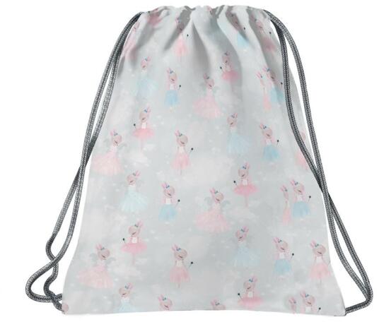 A  BackUp Nyuszis tornazsák bájos tüllszoknyás  balettozó nyuszikkal  a kisiskolás korosztály iskolai szettjének elengedhetetlen kiegészítője.  A BackUp tornazsák teteje madzaggal szűkíthető, háton és vállon hordva is kényelmes viselet. Remek választás iskolai testnevelés órára, edzésre vagy rövidebb kirándulásra.