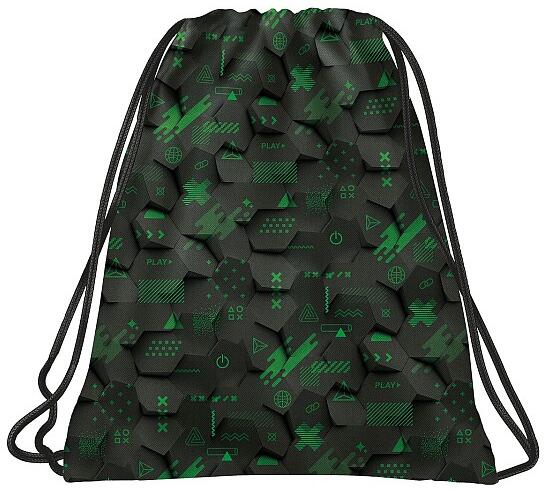 A minőségi tornazsák a számítógépes játék kedvelőinek készült, szürke színén zöld gamer minták láthatók, a kontrollerre emlékeztetve. A zsinórja segítségével egy mozdulattal zárható és nyitható, a gyerekek könnyen kezelik.