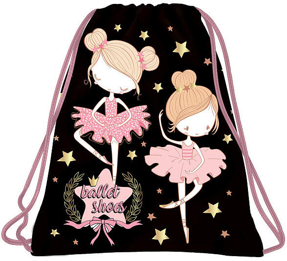Divatos gyerek tornazsák balerinás mintázattal. A fekete és pink színkombináció, a táncoló balerinák látványos és egyedi mintát adnak.