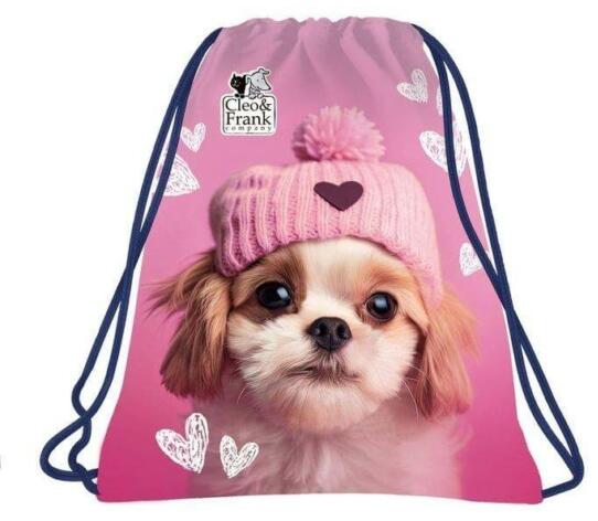 Cleo és Frank kutyás tornazsak - rózsaszín teteje madzaggal szűkíthető. Iskolai testnevelés órára vagy kisebb kirándulásra is remek választás.