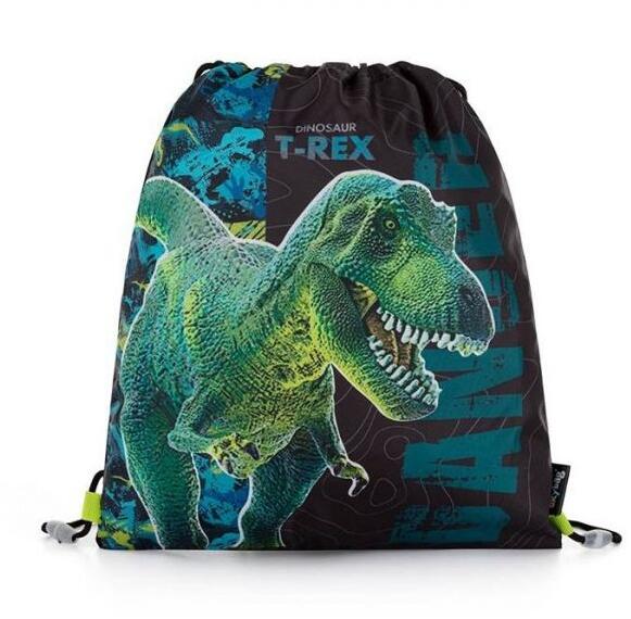 T-Rex dinós mintájú tornazsák fiúknak. Teteje zsinórral összehúzható. Háton is hordható. Mérete: 37x30 cm. Anyaga: 100% poliészter.