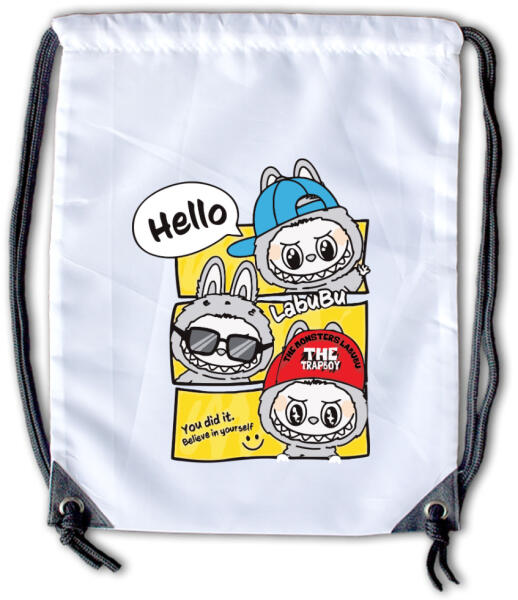 Vidám, Labubu mintás tornazsák strapabíró anyagból. Könnyű, praktikus, ideális ovisoknak és iskolásoknak mindennapi használatra.