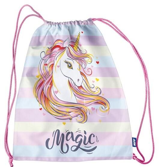 Praktikus iskolai cipőtáska egyszarvúval és húzózsinórral. Alkalmas edzőtermi edzőruhák táskájaként. Erős, minőségi anyagból. A két zsinórnak köszönhetően a táska a hátára helyezhető és hátizsákként is hordható. A táska nedves ruhával könnyen mosható, kézzel mosható. Méretek: 30 x 39 cmGyártó: MFP