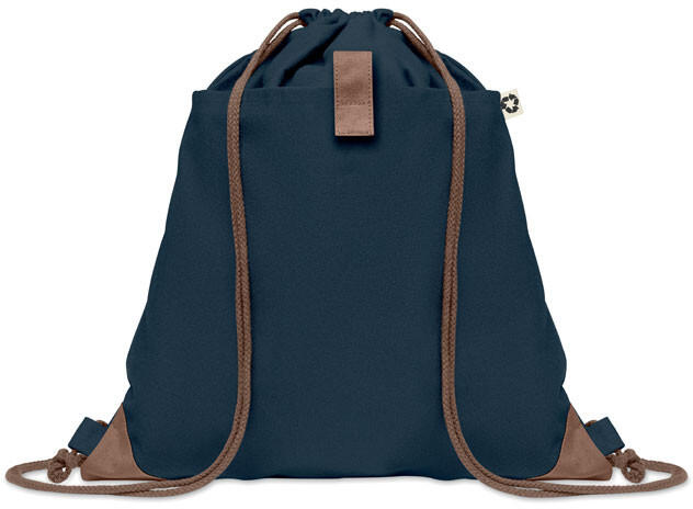 Vastag, 50% pamut és 50% újrahasznosított pamut anyagból készült húzózsinóros táska. Plusz tároló rész az egyik oldalon.