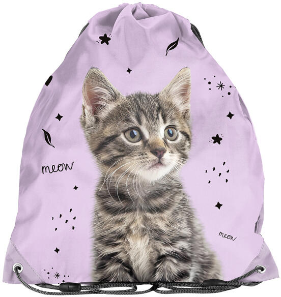 A gyerek tornazsák bájos cicás mintával készült, fekete és lila színösszeállításban. Elején egy szürke csíkos kiscica pózol, körülötte mókás cicás rajzok és apró csillagok láthatók.