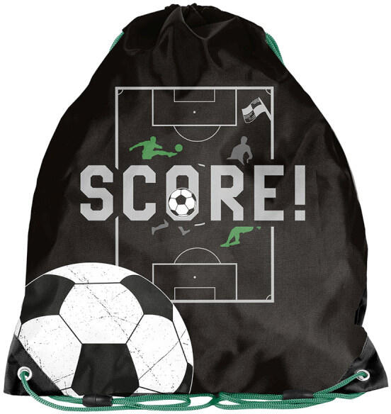 A focis tornazsák mintáján futballpálya-vonalak, játékosok sziluettjei és labdák láthatók. A fekete alapon zöld és fehér elemek dinamikus és sportos megjelenést kölcsönöznek a táskának.