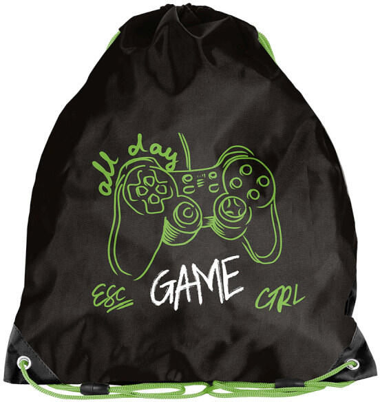 A élénk zöld konzollal mintázott tornazsák ideális választás számítógépes játékokat kedvelő gyerekek részére az iskolába.