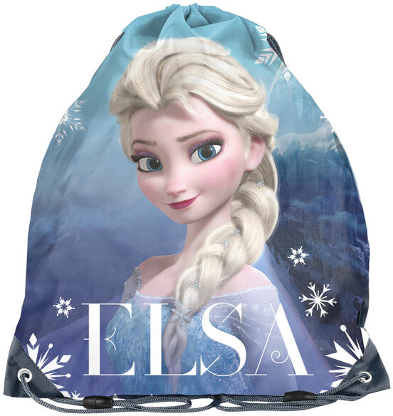 A hópelyhekkel borított kék tornazsák elején a Jégvarázs mese gyönyörű hercegnője, Elsa látható.