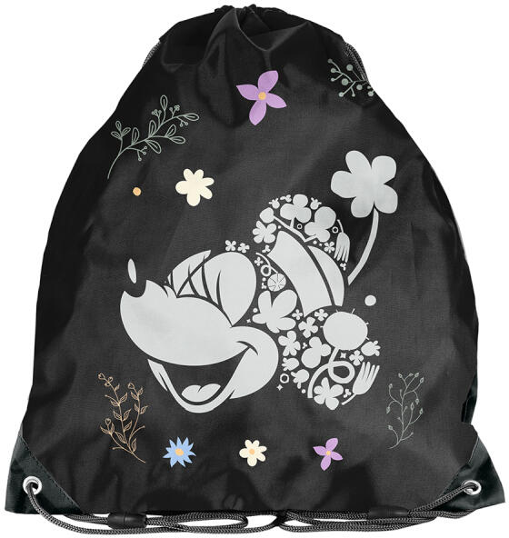 A Minnie tornazsák fekete alapszíne kiemeli az apró, színes virágmintákat, amelyek vidám és természetközeli hangulatot adnak. Minnie egér sziluettje is virágos motívumokkal van díszítve, így még bájosabbá téve az összképet.