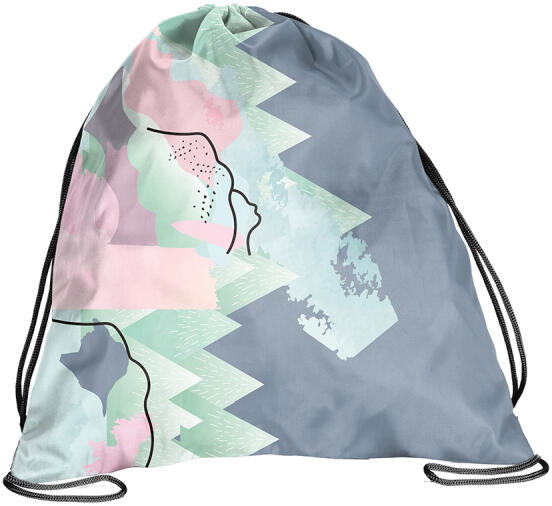 A divatos tornazsák mintája egy művészien absztrakt hegyvidéki tájat idéz meg, pasztell színű árnyalatokkal, mintha egy álomszerű, festett táj elevenedne meg a rajta.