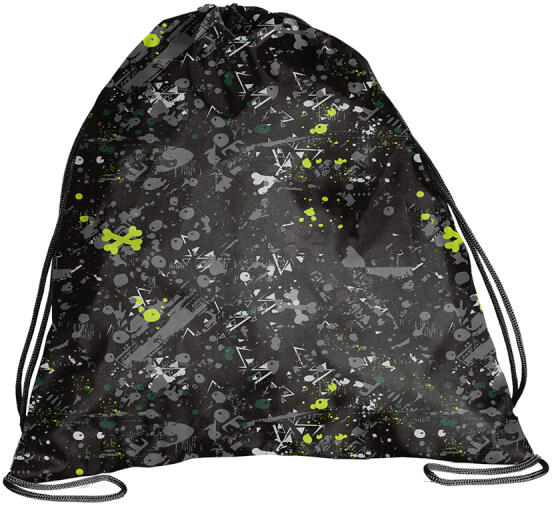 A fiús tornazsák sötét alapszínű, amelyet élénkzöld és szürke festékfröccsenés-szerű minták, valamint geometrikus formák díszítenek.