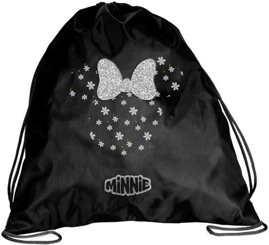 Fekete, virágos tornazsák alsósoknak, divatos Minnie egeres mintával. Minnie alakja apró virágokból rajzolódik ki.