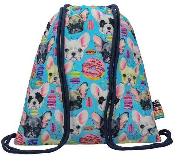 St. Right - Dog zsinóros hátizsák (623172)  cuki kutyusfejekkel és finom sütikkel díszítve. A teteje zsinórral szűkíthető és egy külső cipzáros zsebben tárolhatóak az apróságok. A puha sodrott zsinór szolgál vállpántként is. Könnyű és divatos hátizsák kicsiknek és nagyoknak egyaránt.