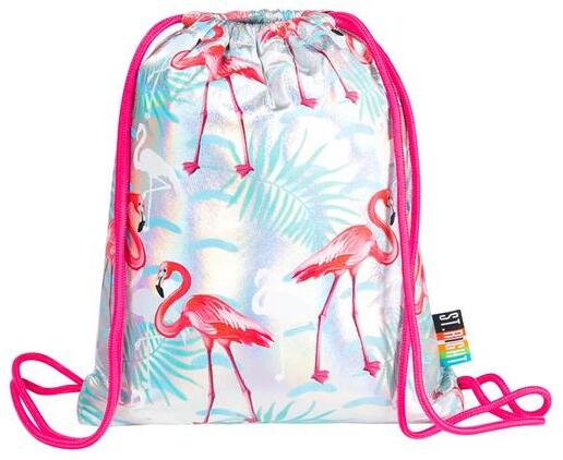 St. Right - Flamingós zsinóros hátizsák - Holografikus  mintával a nagyobb korosztály számára. A teteje zsinórral szűkíthető és egy külső cipzáros zsebben tárolhatóak az apróságok. A puha sodrott zsinór szolgál vállpántként. Könnyű és divatos hátizsák kiránduláshoz, edzésre vagy egy városi séta alkalmával.