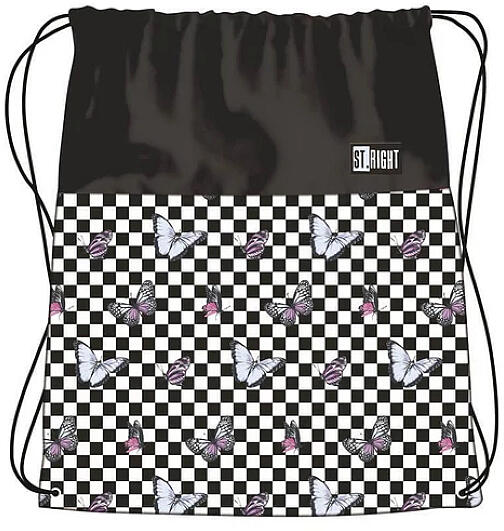 Divatos fekete-fehér kockás tornazsák alsós lányoknak, pillangós mintával.