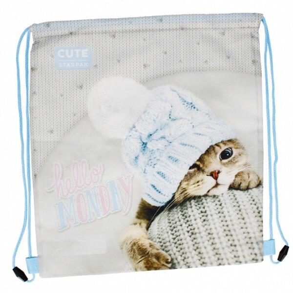 Ha meglátod ezt a cuki cicát, biztos, hogy te is imádni fogod a hétfőket, amikor iskolába kell indulnod! Az ezüst és világoskék tornazsák elején egy sapkában üldögélő cica látható. A divatos tornazsák a kisállatok szerelmeseinek ideális választás iskolai vagy szabadidős használatra is. A gyerekek hátizsáknak is szívesen használják.