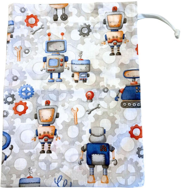 Vidám robotok tornazsák Kiváló minőségű, 100% pamutból készült tornazsák. Óvodába és iskolába is egyaránt ideális választás, melybe a gyermek könnyedén tárolhatkja tornafelszerelését. A tornazsák a tetejébe varrt zsinorral záródik. Méretei: 28x38 cm.